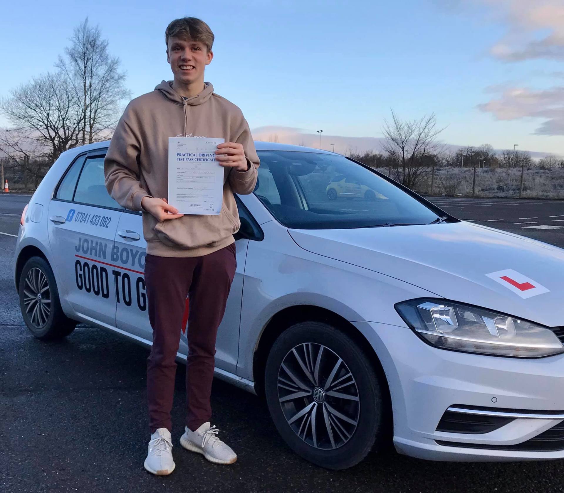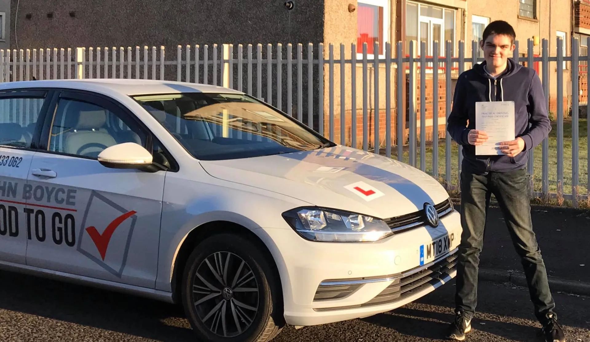 Congratulations to Sam Glen from Cumbernauld on passing his driving test at the first attempt this morning. Nice tidy drive. Good comments from the examiner. Thanks for choosing me as your instructor, with John Boyce you’re Good to Go ππ